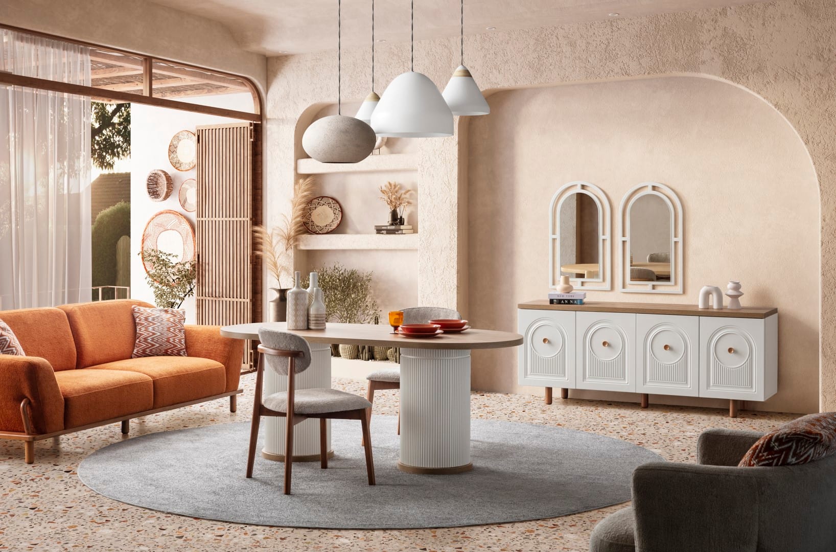 Bohem tarzın eşsiz öğelerini barındıran Palermo Yemek Odası, doğal ve dokunsal malzemelerin yanı sıra canlı renkler ve desenlerle de dikkat çeker. Zarif detaylar ve özgün tasarımıyla evinize sıcaklık ve samimiyet getirirken, aynı zamanda modern dokunuşlarla da öne çıkar.